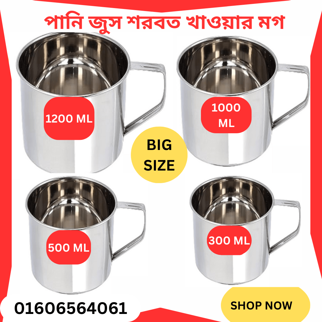 3.Premium Stainless Steel Mug 4 PCS Size1= 1200 ML,1000 ML, 500ML,300 ML